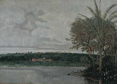 - Cidade e Forte de Frederik na Paraíba (E), óleo sobre tela do pintor holandês Frans Post (1612–1680), produzido em 1638; no livro Varadouro — soneto em preto e branco, registro fotográfico de uma área residencial do Porto do Capim | Imagem: Reprodução/Fundación Cisneros