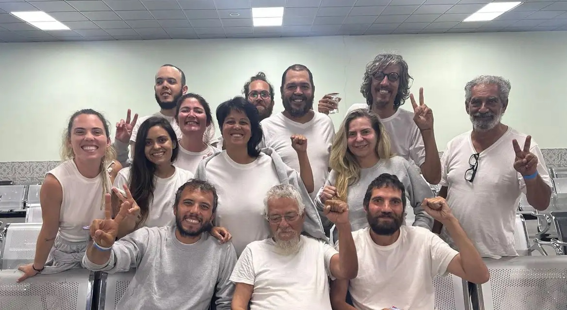 João (de óculos, em pé, à direita) e outros 12 brasileiros que integravam a flotilha foram interceptados pelo governo de Israel | Foto: Divulgação/Global Samud