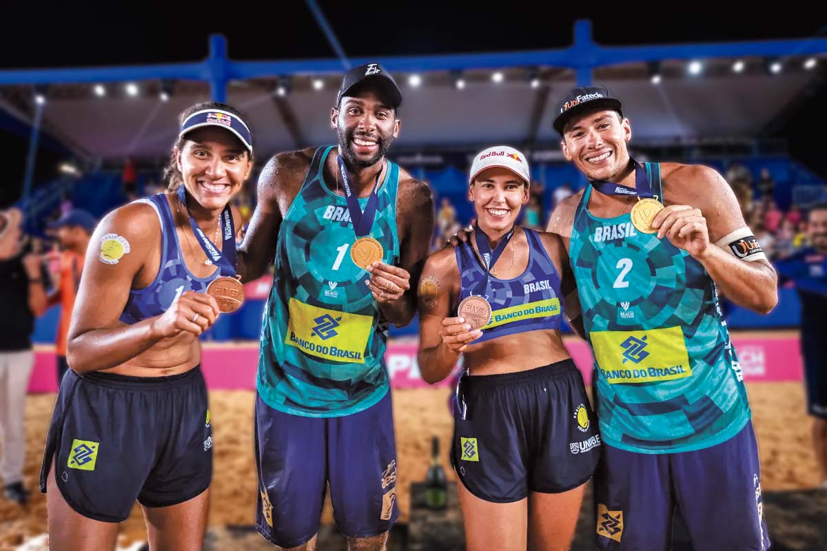 As duplas brasileiras com as medalhas, sendo ouro para o masculino e bronze para o feminino | Foto: Divulgação/CBV
