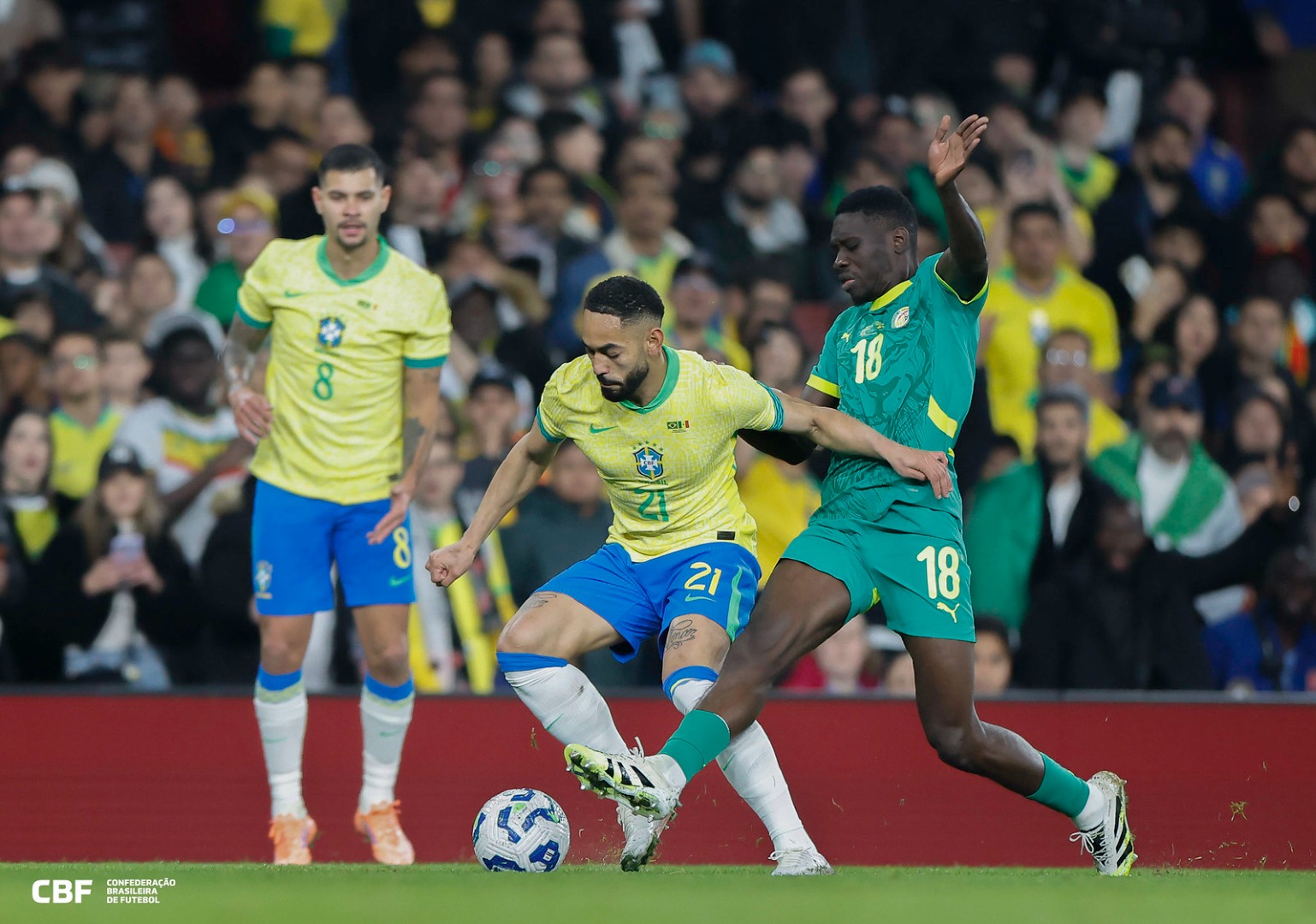 O paraibano Matheus Cunha em ação no jogo contra Senegal, observado por Bruno Guimarães | Foto: Rafael Ribeiro/CBF