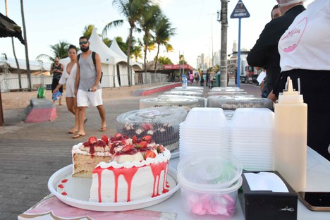 Para testar o autocontrole de quem se exercita na praia ou caminha pelas praças de João Pessoa, bancas com bolos recheados ocupam esses espaços com cores irresistíveis. Cobertos por caldas brilhantes e exibindo uma variedade que nada deve às vitrines das melhores confeitarias, eles transformam cada ponto de venda em um convite ao prazer.