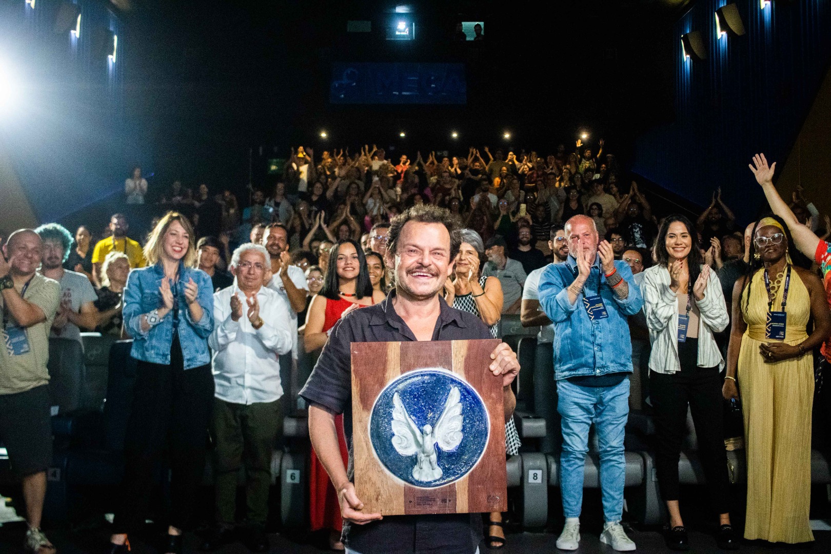 Matheus Nachtergaele, com a obra de Chico Ferreira: “Quando alguém sorri para mim, sei que esta pessoa, de alguma forma, está sorrindo para João Grilo” | Fotos: Natalia Di Lorenzo/FestiniCineJP