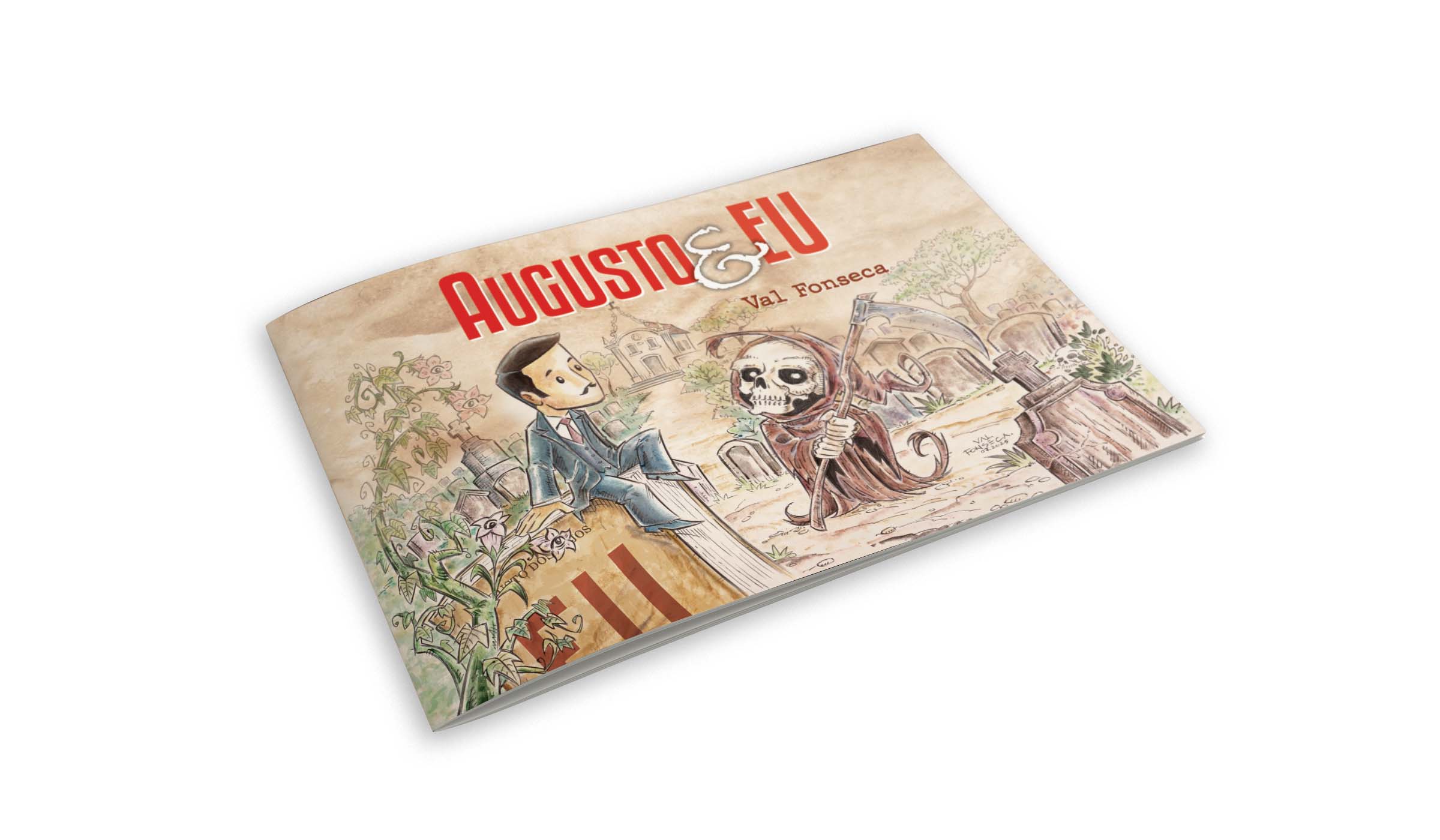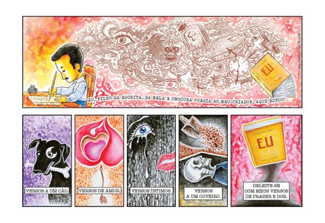 Em 2013, o quadrinista Henrique Magalhães resolveu formar um grupo de artistas, capitaneando a iniciativa de publicar diariamente tirinhas variadas em A União, com regime de rodízio entre autores. Um deles era o ilustrador e quadrinista Val Fonseca, que começou às quartas--feiras com a tirinha Árvores, mas, diante da desistência gradativa de outros participantes, assumiu também a tira cômica do domingo, voltando-se para a obra do poeta paraibano Augusto dos Anjos (1884–1914). Resulta da experiência o livro Augusto & eu (Independente, 56 páginas, R$ 30), a ser lançado amanhã, às 14h, no Memorial Augusto dos Anjos, em Sapé, por intermédio da Academia Sapeense de Letras, Artes e Cultura (Aslac).