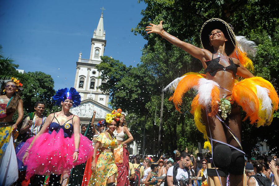 A instrutora e foliã de pernas de pau Raquel Potí vestiu a fantasia de Leila Diniz, a homenageada deste ano