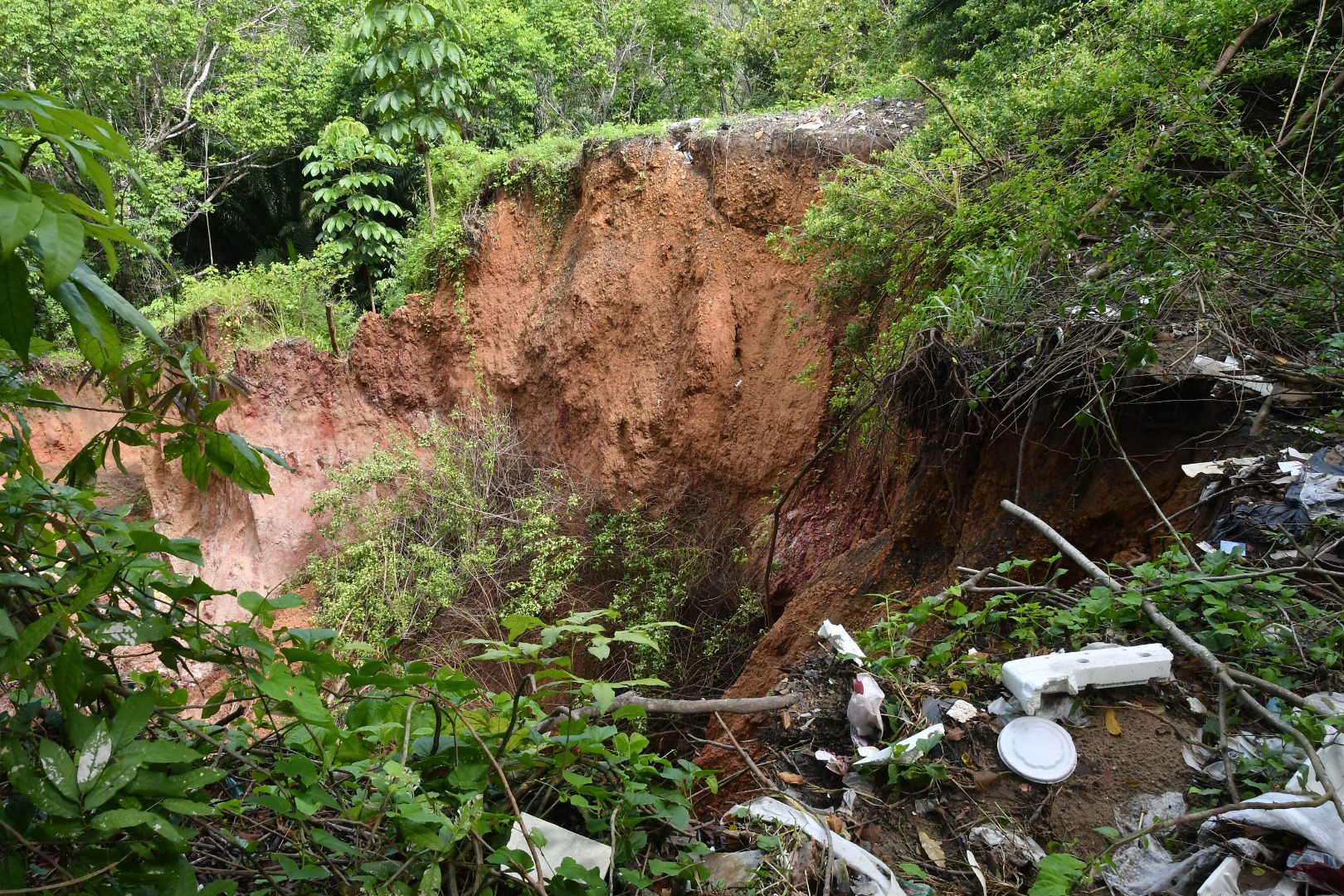 Águas também arrastaram lixo para a cratera; Secretaria de Infraestrutura informou que enviaria uma equipe ao local | Foto: Leonardo Ariel