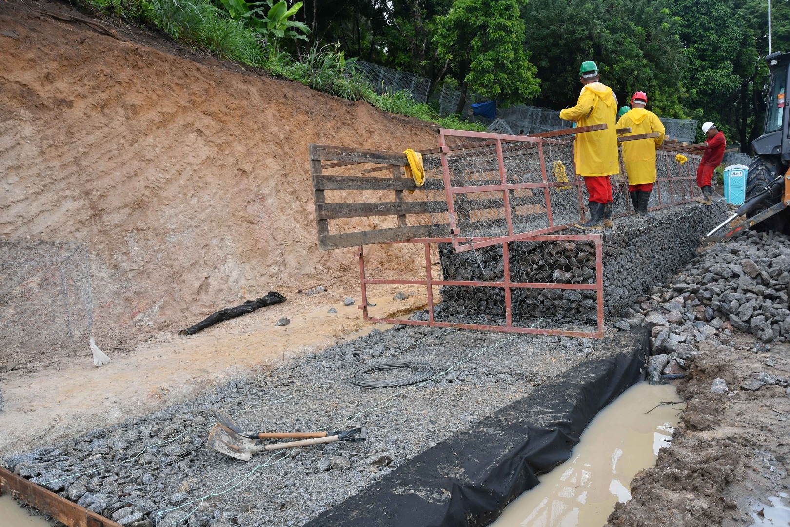 Trabalhadores instalam muro de contenção na barreira localizada no bairro Castelo Branco, às margens da BR-230 | Foto: Leonardo Ariel